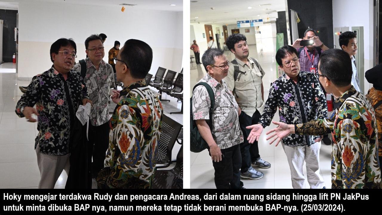 Selaku terdakwa Rudy menjawab : “Hal itu benar ada, yaitu putusan PN Jakarta Selatan Tahun 2018, kemudian naik banding PT, lalu Kasasi. Dan terakhir tahun lalu Pak Hoky telah mengajukan PK dan PK nya telah ditolak.”