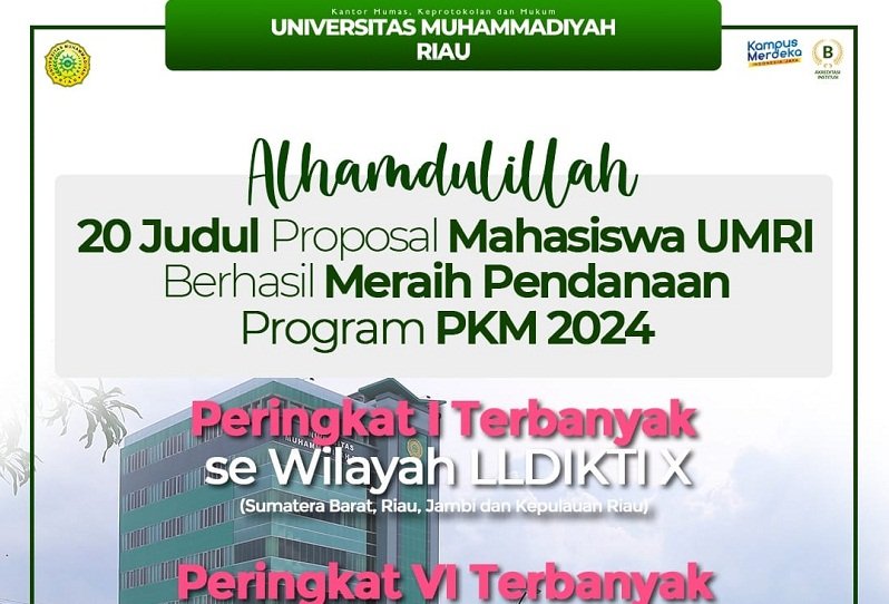 Di tahun 2024 Universitas Muhammadiyah Riau (Umri) kembali mendulang prestasi di bidang kemahasiswaan, hal ini tergambar dari lolosnya sebanyak 20 proposal mahasiswa dalam program Pendanaan Program Kreativitas Mahasiswa (PKM) dimaksud.