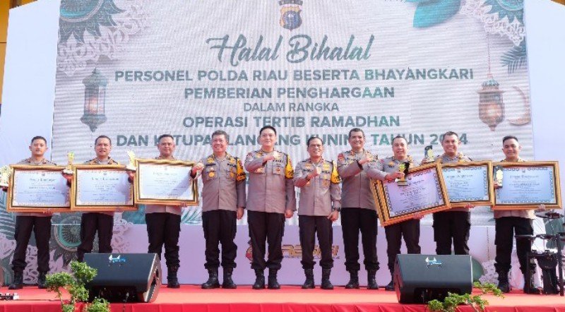 Penyerahan penghargaan diserahkan langsung oleh Kapolda Riau Irjen M Iqbal didampingi Wakapolda Brigjen K Rahmadi di acara Halal bi halal Polda Riau pelaksanaan di halaman depan Mapolda Riau, Jalan Pattimura Pekanbaru, Senin (22/04/2024) pagi.