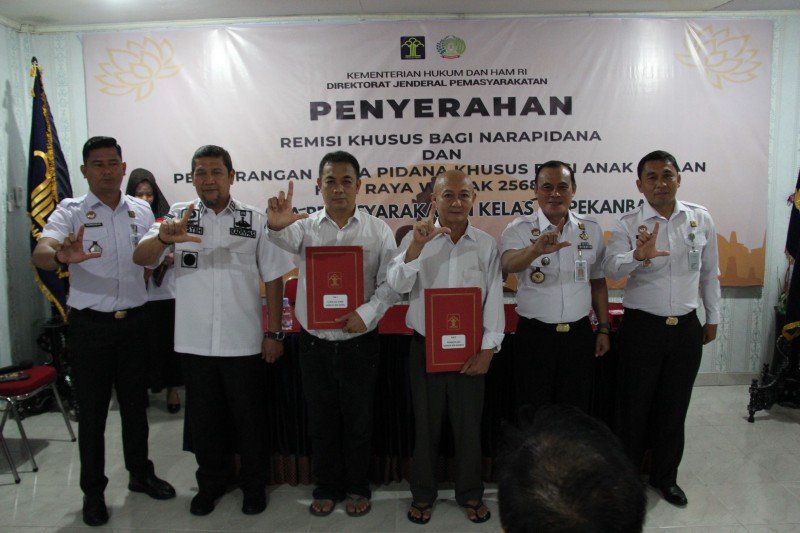Acara pemberian remisi ini berlangsung di ruang sekretariat Wilayah Bebas dari Korupsi (WBBM) Lapas Kelas IIA Pekanbaru dan dihadiri langsung oleh Kepala Divisi Pemasyarakatan (Kadivpas) Kantor Wilayah Kementerian Hukum dan HAM Riau, Muhammad Ali Syech Banna, serta didampingi oleh Kepala Lapas Kelas IIA Pekanbaru, Sapto Winarno, Kamis (23/05/2024).
