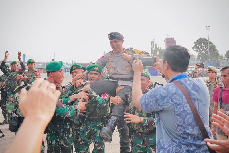Kapolda Sumsel Irjen A Rachmad Wibowo hadir diacara bersama Pejabat Utama Polda tersebut, sehingga membuat suasana sinergitas semakin bergaung. Sejurus kemudian, baik Pangdam II Sriwijaya dan juga Kapolda Sumsel dibopong serta dielu elukan oleh pasukan satgas yang akan diberangkatkan pada tugas operasi tersebut dengan iringan lagu penyemangat khas pasukan.