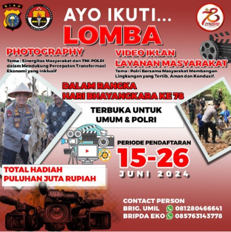 “Ayo ikuti lomba Fotografi dan Video ILM tersebut dalam rangka semarak Hari Bhayangkara ke-78. Tunjukkan kreasi dan kreatifitas masyarakat Riau yang terbaik,” ajaknya.