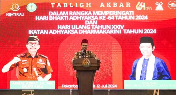 Kepala Kejaksaan Tinggi Riau, Akmal Abbas menjelaskan, kegiatan tablig Akbar bersama UAS ini merupakan rangkaian Hari Bakti Adhyaksa (HBA) ke 64 tahun 2024.