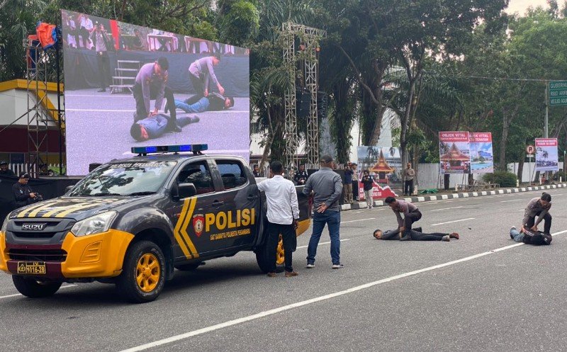 Berbagai adegan simulasi pengamanan Pemilu Kepala Daerah (Pilkada) hingga pengamanan demonstrasi masyarakat yang menolak hasil pilkada digedung KPU Kota Pekanbaru juga tampak diperagaan dalam acara tersebut.