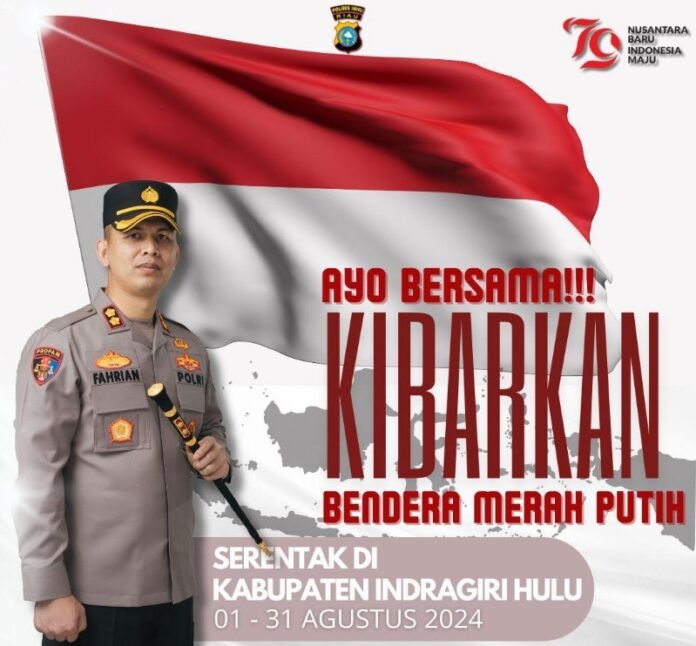 Inhu (Nadariau.com) – Guna memeriahkan Hari Kemerdekaan RI ke 79, Kapolres Inhu, AKBP Fahrian Saleh Siregar mengajak dan mengimbau kepada seluruh elemen masyarakat Kabupaten Inhu untuk mengibarkan bendera merah putih dihalaman rumah masing-masing, dari tanggal 01 hingga 31 Agustus 2024.