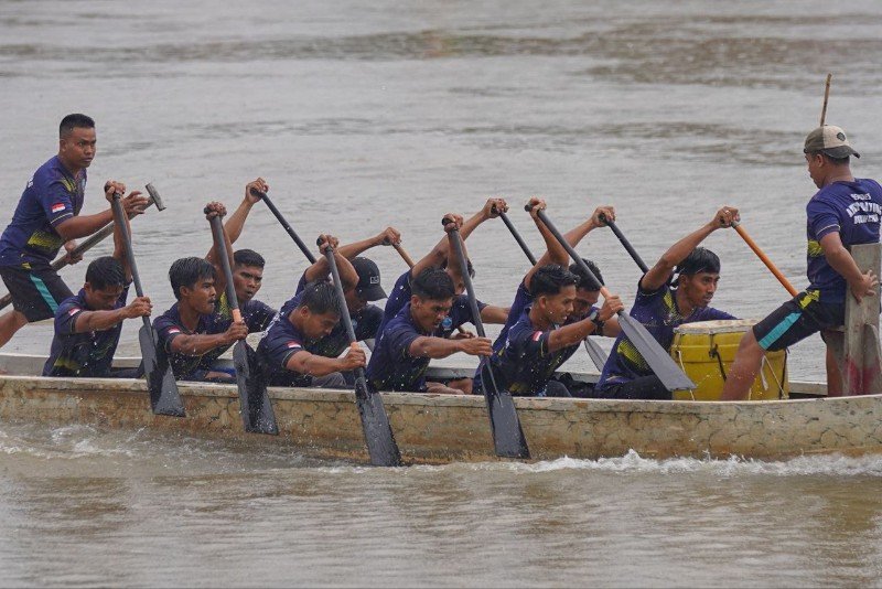 Riuh ratusan penonton bersorak-sorai di tepian sungai. Mereka tampak antusias mendukung sampan kebanggaannya.