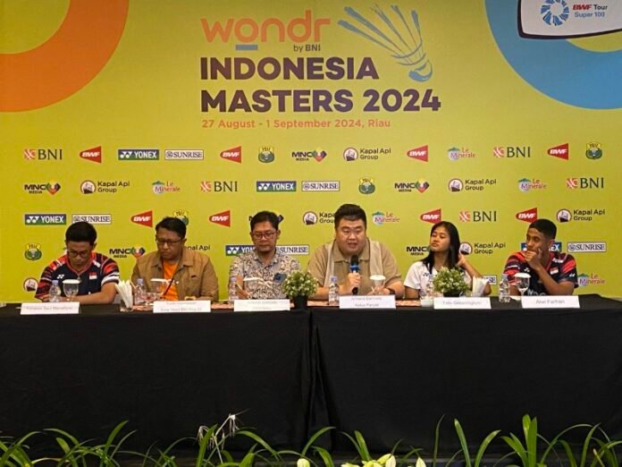 Pekanbaru (Nadariau.com) – Panitia turnamen Wondr BNI Indonesia Masters 2024 BWF Super Series menggelar konferensi pers, di hotel Prime Park Jalan Jenderal Sudirman, Kota Pekanbaru, Senin (26/08/2024).