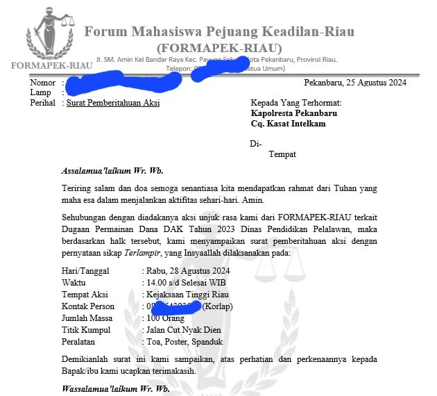 Saat di konfirmasi, koordinator lapangan aksi Formapek Arizal mengakui surat pemberitahuan aksi itu benar. Mereka akan turun pada Rabu lusa di Kejati Riau.