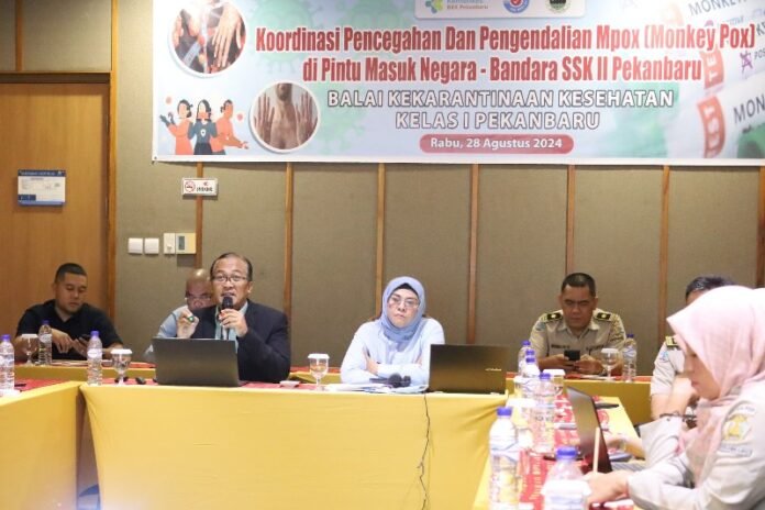 Pekanbaru (Nadariau.com) – Bandara Internasional Sultan Syarif Kasim (SSK) II Pekanbaru bersama Balai Kekarantinaan Kesehatan (BKK) Kelas 1 Pekanbaru menggelar rapat koordinasi terkait pencegahan dan pengendalian Monkey Pox (Mpox) di pintu masuk negara melalui Bandara Internasional SSK II Pekanbaru. Pertemuan ini melibatkan Komite Fasilitasi (FAL) Bandara Internasional SSK II Pekanbaru.