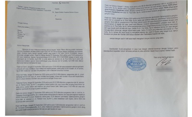 Kemudian Selasa (01/10/2024) pagi, sekitar pukul 08.30 Wib, dokter anestesi bernama dr Popi Sofia melakukan pengecekan dan mengatakan bahwa benar keluhan korban tersebut adalah PDPH (Post Dural Puncture Headache).
