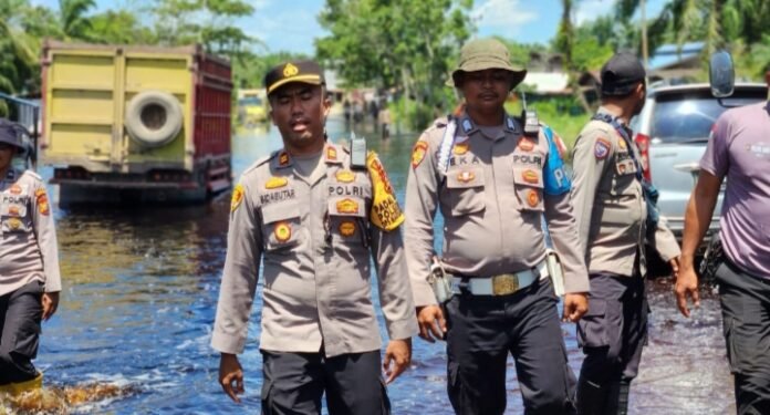 Kapolres Rohil AKBP Isa Imam Syahroni, S.I.K M.H. melalui Plh Kasi Humas Polres Rohil Ipda Fahrudin Ahmadi S.Pd menjelaskan pemasangan tenda posko banjir dan Pengecekan Ketinggian Air pihaknya juga memberikan himbauan kepada warga di lokasi Banjir.