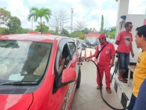 Lain pula halnya dengan Nurhayati, pemilik Daihatsu Ayla warna merah itu pede dalam antrian terdepan, ia ramah menyapa petugas SPBU, sambil melirik nama operator yang terpampang di seragam pertamina di dada sebelah kiri tepat di atas saku baju kebanggaan pelayanan “mulai dari nol” itu.
