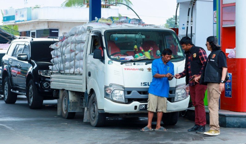 Personel Ditreskrimum Polda Riau Aipda Anhar Rudali dan beberapa personel lainnya menyambangi beberapa tempat SPBU di Kota Pekanbaru yang sering terjadi antrian panjang dalam pengisian BBM bersubsidi jenis Pertalite dan Biosolar, Kamis (31/10/2024).