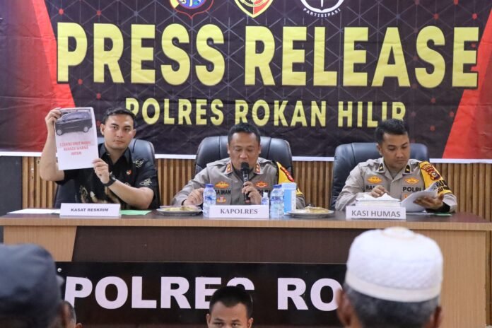 Rokan Hilir, Nadariau Com – Kapolres Rohil AKBP Isa Imam Syahroni, S.I.K M.H. Didampingi Kasat Reskrim Polres Rohil AKP AKP I Putu Adi Juniwinata, S.Tr.K., S.I.K., M.Si, Kanit II Sat Reskrim Polres Rohil Iptu Ridho Alfian Syahputra S.TrK dan Plh Kasi Humas Polres Rohil Ipda Fahrudin Ahmadi Rambe, S.Pd. dan Personel, menggelar Press release bertempat di Ruang Aula Patriatama Polres Rohil, Jum’at 1 Nopember 2024. Pukul 13: 30 WIB.