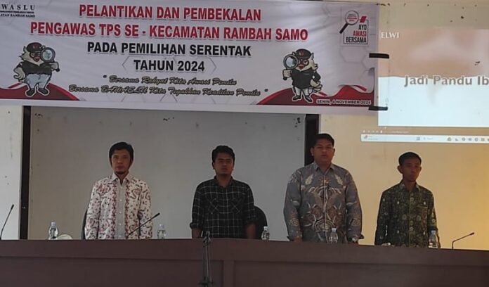 Terpantau dalam kegiatan pelantikan dan pembekalan pengawas TPS se – Kec. Rambah Samo tersebut, Camat Rambah Samo, Elfitren diwakili oleh Kasi PMD Suntoro, SAP, Danramil 02 Rambah, diwaklil Serka Basridul, KUA Rambah Samo, Syamsuar, SAg, Ketua PPK Rambah Samo, Reza Pahlefi, Ketua Panwas Rambah Samo, Teza Ramadhani, ST, Kades Rambah Samo Barat, Pauzi, SPd, Bhabinkamtibmas Bripka Joni Hendri, serta para peserta PTPS se – Kec. Rambah Samo yang akan dilantik.