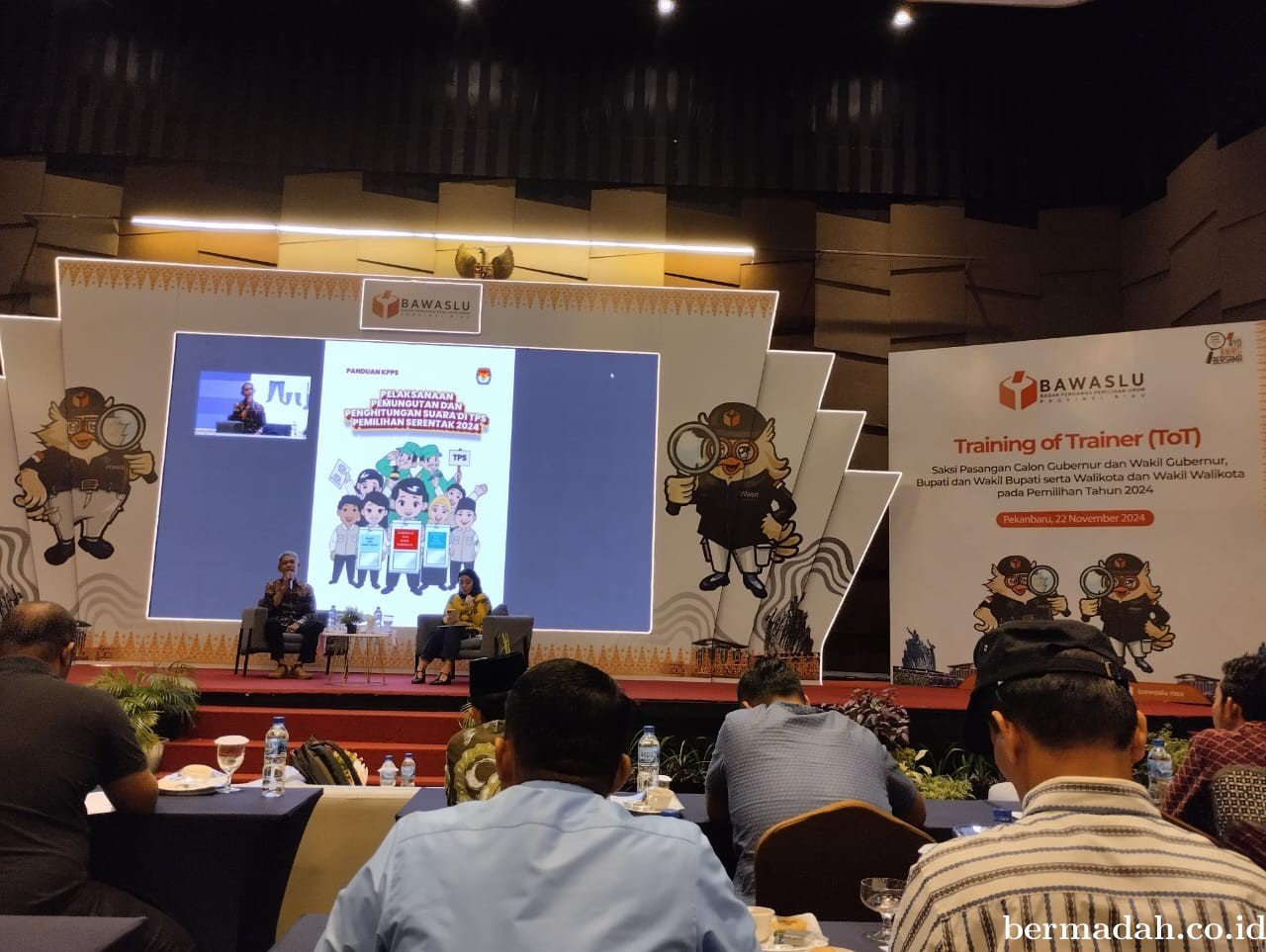 Pekanbaru (Nadariau.com) – Badan Pengawas Pemilu (Bawaslu) Riau menaja Training of Trainer (ToT) para saksi Pasangan Calon (Paslon) Gubernur dan Wakil Gubernur, Bupati dan Wakil Bupati, juga Wali Kota dan Wakil Wali Kota. Kegiatan ini, bertempat di salah satu hotel, hari Jumat (22//11/2024).