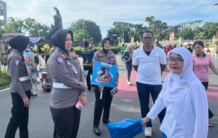 Tim Cooling System Ditlantas Polda Riau yang dipimpin langsung Kasi BPKB Subdit Regident Ditlantas Polda Riau Kompol Rosna Meilani bersama Tim kembali menyapa para pengunjung CFD Pekanbaru dengan melaksanakan kegiatan edukasi himbauan Kamtibmas dan Kamseltibcarlantas, Minggu (08/12/2024) pagi.