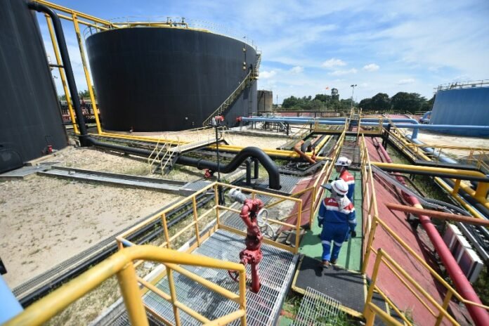 Seorang pekerja sedang melakukan peninjauan di lapangan minyak.