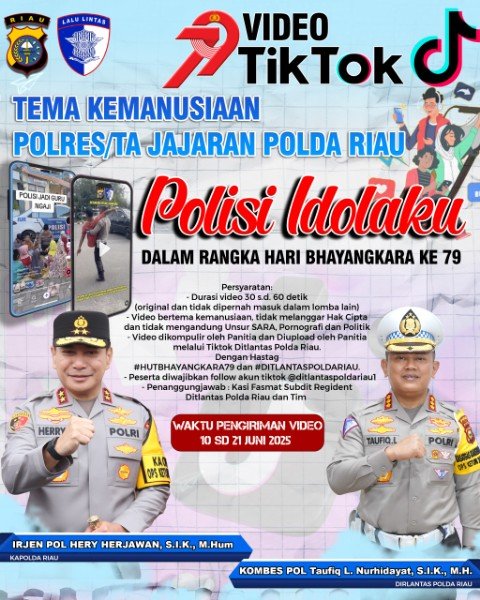 Pekanbaru (Nadariau.com) – Dalam rangka memperingati Hari Bhayangkara ke-79, Direktorat Lalu Lintas (Ditlantas) Polda Riau melalui Subdit Regident menyelenggarakan Lomba Video TikTok bertema “Kemanusiaan” yang diikuti oleh seluruh jajaran Polres/Ta se-Polda Riau. Lomba ini mengangkat tajuk “Polisi Idolaku” sebagai bentuk kampanye humanis dari institusi kepolisian kepada masyarakat.
