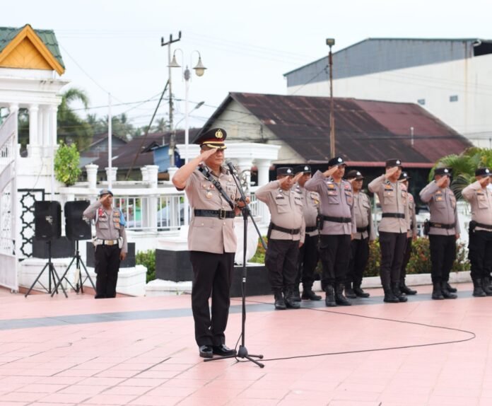 Upacara tabur bunga Polres Rohil dalam rangka HUT Bhayangkara ke- 79, tahun 2025, dihadiri Ketua Bhayangkari Cabang Rokan Hilir Ny. Fikih Isa, Wakapolres Rohil Kompol Rikky Operiady, S.Sos.,S.I.K.,M.I.K. Wakil Ketua Bhayangkari Cab. Rokan Hilir Ny. Queen Rikky Kabag SDM Polres Rohil Kompol Amriadi,S.H, Kabag OPS Polres Rohil Kompol Afrizal, Kapolsek Bangko AKP Buyung Kardinal, S.H.,M.H, Kasat Reskrim Polres Rokan Hilir AKP I Putu Adi Juniwinata, S.TrK, Kasat Lantas Polres Rokan Hilir AKP Luthfi Indra Praja,.S.Tr.K dan Kasat Polairud Polres Rokan Hilir AKP Ricky Marzuki,.S.H.