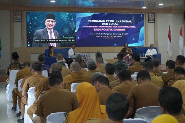 Asahan (Nadariau.com) – Diskusi panel pemisahan pemilu nasional dan lokal di Kabupaten Asahan yang diselenggarakan oleh Demokrasi Sumber Daya Insani (Demokrasi) Kabupaten Asahan diikuti oleh Bupati Asahan, Taufik Zainal Abidin, S.Sos., M. Si, di Aula Zulfirman Universitas Asahan, Selasa (29/07/2025).