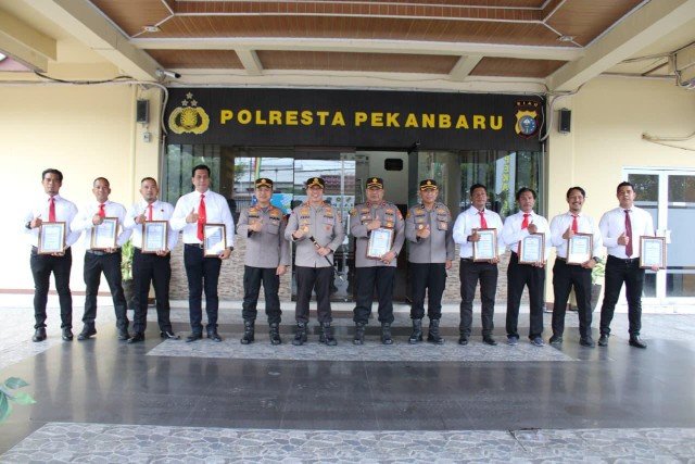 Apel penghargaan ini turut dihadiri Wakapolresta Pekanbaru AKBP Ronald Sumaja, para Kabag, Kasat, Kasi, serta seluruh perwira jajaran Polresta Pekanbaru.