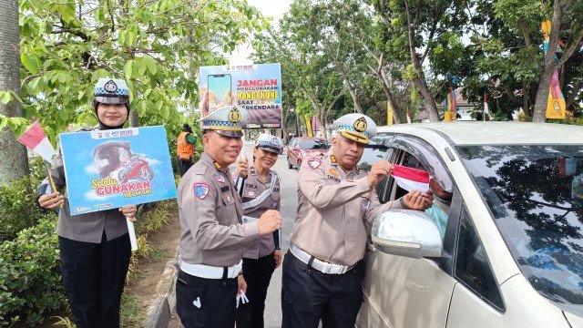 Di simpang lampu merah depan kediaman Kapolda Riau, para pengendara roda dua dan roda empat tersenyum ketika disapa oleh personel Subdit Kamsel Ditlantas Polda Riau. Tidak hanya sapaan ramah, mereka juga menerima bunga, bendera Merah Putih, serta brosur himbauan keselamatan berkendara.