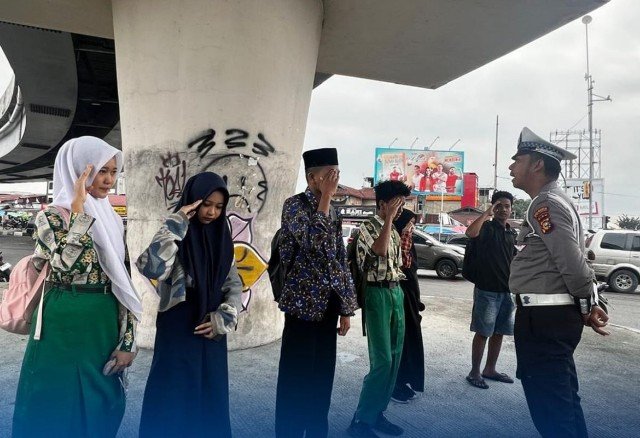 Pekanbaru (Nadariau.com) – Aksi unik dilakukan personel Satlantas Polresta Pekanbaru saat menindak sejumlah pelajar yang kedapatan melanggar aturan lalu lintas di Jalan Soekarno Hatta, Kamis (28/08/2025) pagi.