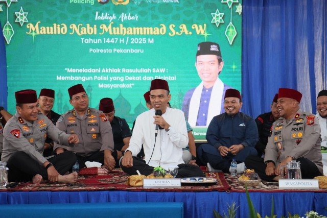 Pekanbaru (Nadariau.com) – Polresta Pekanbaru menggelar Tabligh Akbar Maulid Nabi Muhammad SAW bersama Ustad Abdul Somad (UAS) di halaman Mapolresta Pekanbaru, Jalan Ahmad Yani, Jumat (12/09/2025).