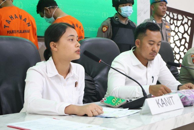 Kasat Reskrim Polres Pelalawan, AKP I Gede Yoga Eka Pranata didampingi Kasi Humas Iptu Thomas Bernandes Siahaan dan Kanit PPA Ipda Marta Christina Marpaung menjelaskan pelaku ZU ditangkap pada 2 September 2025.