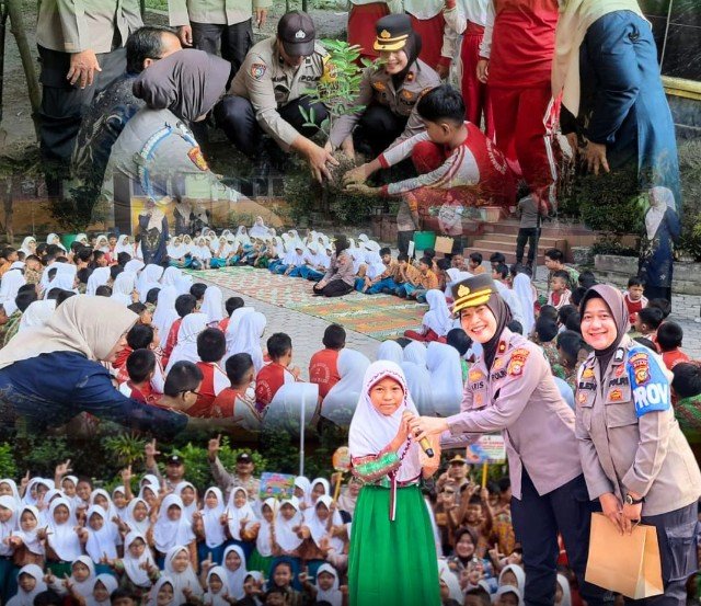 Suasana penuh semangat terlihat ketika guru, polisi, dan siswa bergotong royong menanam bibit pohon di berbagai sudut sekolah. Canda tawa anak-anak berpadu dengan semangat kepedulian lingkungan, menciptakan atmosfer kebersamaan yang hangat.
