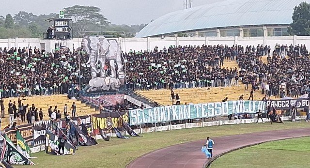 Pekanbaru (Nadariau.com) – Suasana haru menyelimuti Stadion Kaharuddin Nasution, Pekanbaru, Sabtu (20/9/2025) petang, saat ribuan suporter PSPS Pekanbaru di tribun utara membentangkan spanduk raksasa bergambar gajah dengan tulisan “R.I.P Tari, Selamatkan Tesso Nilo”.