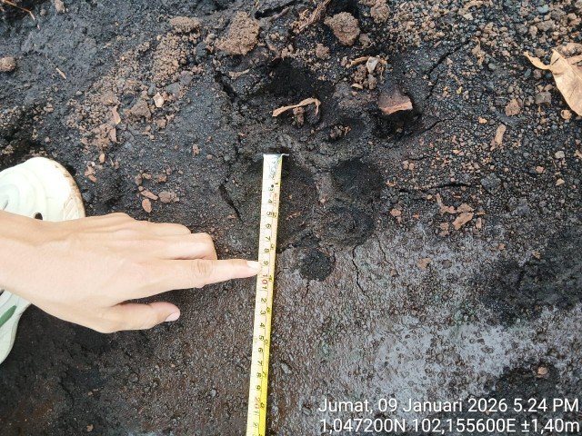 Dari hasil pengecekan lapangan bersama perangkat desa, tim BBKSDA Riau menemukan jejak Harimau Sumatera berukuran sekitar 12 sentimeter, yang diperkirakan berasal dari satu individu. Jejak tersebut ditemukan di koordinat 1,047200 LU dan 102,155600 BT.