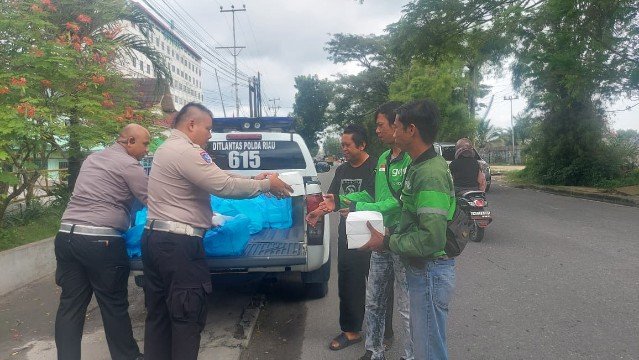 Selain membagikan paket nasi kotak untuk makan siang, personel Ditlantas Polda Riau juga menyampaikan pesan edukasi Kamtibmas, Kamseltibcarlantas, serta sosialisasi Program Green Policing guna meningkatkan kesadaran masyarakat akan keselamatan berlalu lintas dan kepedulian terhadap lingkungan.