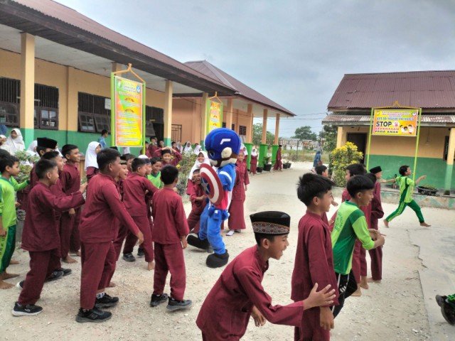 Kedatangan rombongan disambut meriah oleh Kepala Sekolah SD Negeri 042 Kualu Ismanuria, S.Pd, majelis guru, serta seluruh siswa-siswi. Sorak sorai dan senyum ceria langsung pecah ketika anak-anak melihat Kapten Amerika dan Spiderman membagikan makanan bergizi.