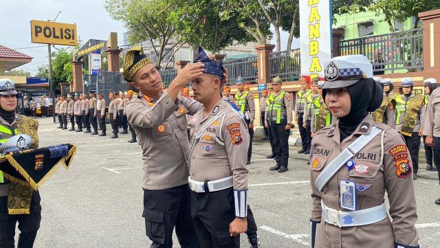 Pekanbaru (Nadariau.com) – Dalam upaya melestarikan budaya Melayu serta memperkuat nilai-nilai kearifan lokal, seluruh personel jajaran Polresta Pekanbaru kini resmi menggunakan tanjak dan selempang setiap hari Jumat saat bertugas.