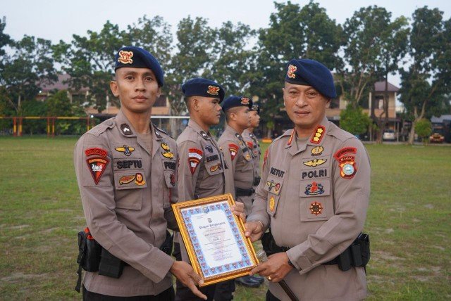Pekanbaru (Nadariau.com) – Satuan Brimob Polda Riau memberikan penghargaan kepada sejumlah personel yang berhasil menorehkan prestasi di berbagai ajang olahraga tingkat daerah hingga nasional. Apel pemberian penghargaan tersebut digelar di Lapangan Hijau Mako Satuan Brimob Polda Riau, Kamis (05/03/2026).