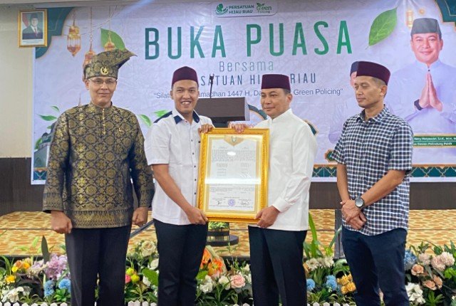 Pekanbaru (Nadariau.com) – Persatuan Hijau Riau (PeHR) secara resmi menganugerahkan Maklumat Hari Ekosistem Riau kepada Kapolda Riau, Irjen Pol. Dr. Herry Heryawan, S.I.K., M.H., M.Hum., dalam momentum Silaturahmi Ramadhan dan Buka Puasa Bersama PeHR yang digelar di Hotel Grand Central Pekanbaru, Kamis (12/03/2026).