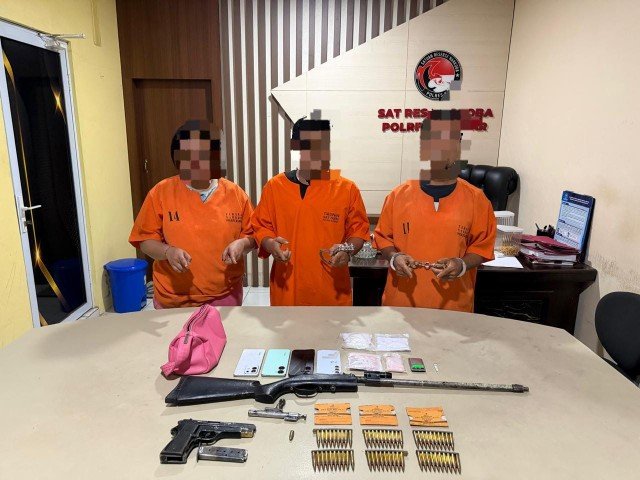 Tak hanya narkotika, petugas juga menemukan dua pucuk senjata api rakitan lengkap dengan puluhan butir amunisi, yang diduga kuat berkaitan dengan aktivitas ilegal para pelaku.
