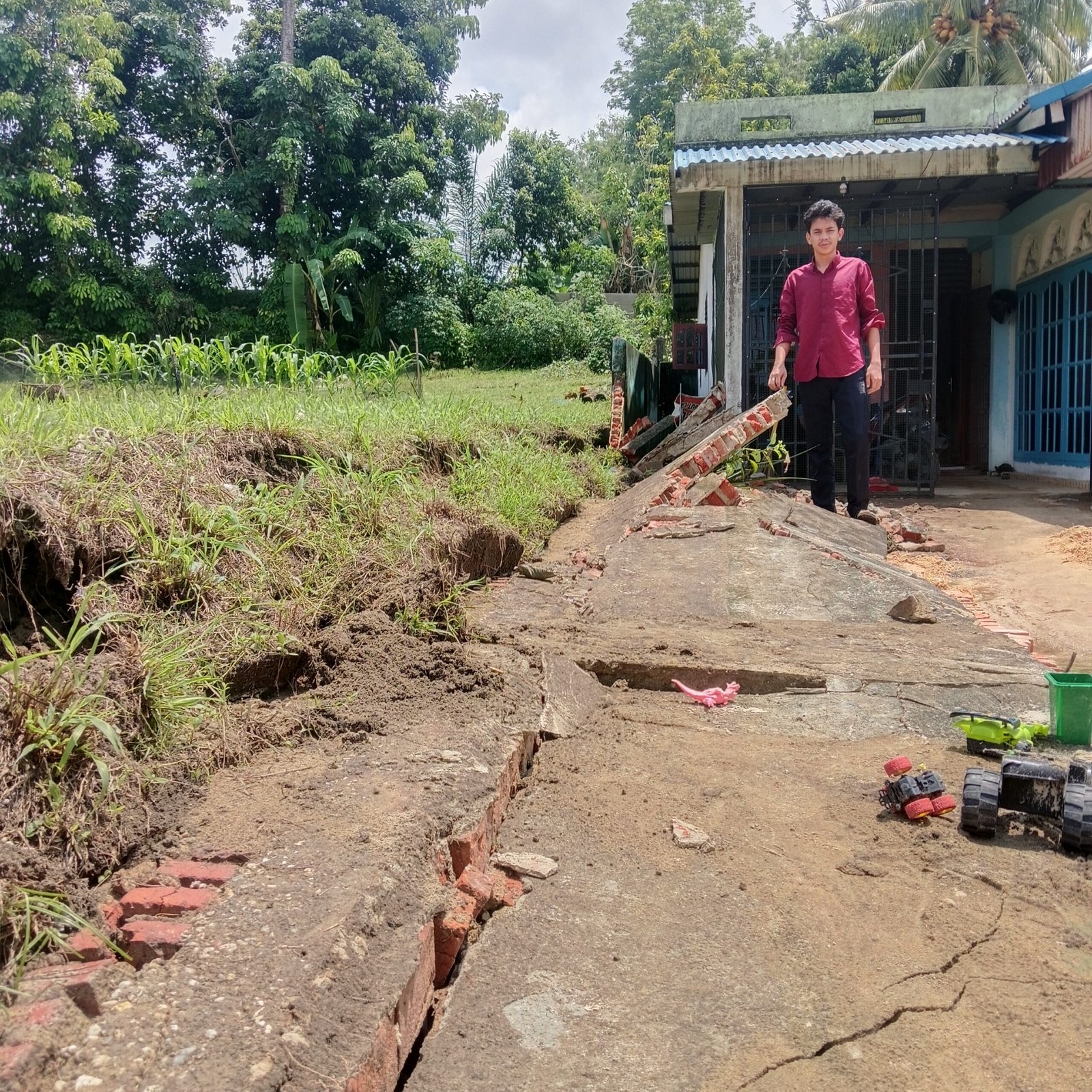 “Karena hari itu (Senin, 20 April 2026) hujan cukup lebat sehingga air yang tergenang di yayasan cukup banyak dan akhirnya melimpah ke bawah langsung menghantam rumah saya sehingga tembok pagar rumah menjadi roboh,” tutur Oloan.
