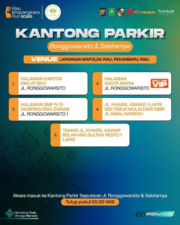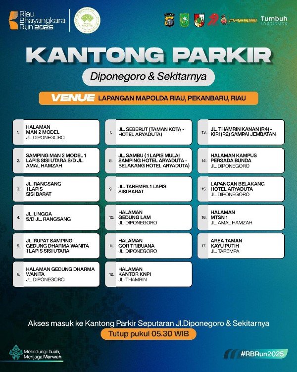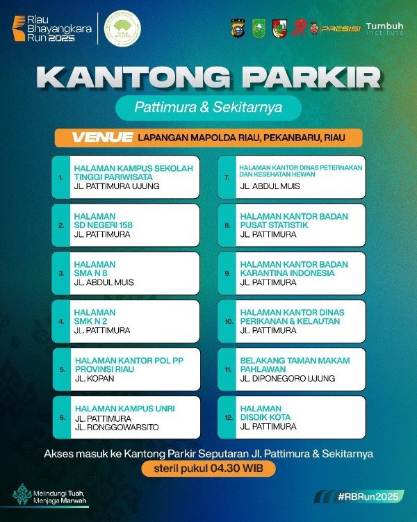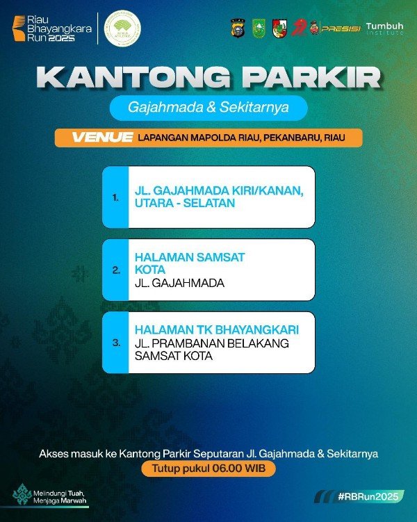 Pekanbaru (Nadariau.com) – Dalam rangka mendukung kelancaran dan kenyamanan peserta Riau Bhayangkara Run 2025, panitia resmi menyiapkan 39 kantong parkir gratis di sejumlah titik yang berada disekitar lokasi acara.
